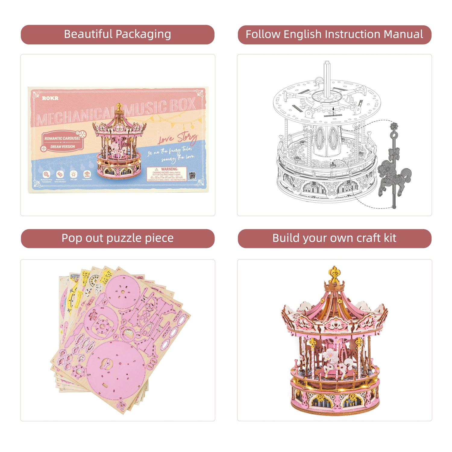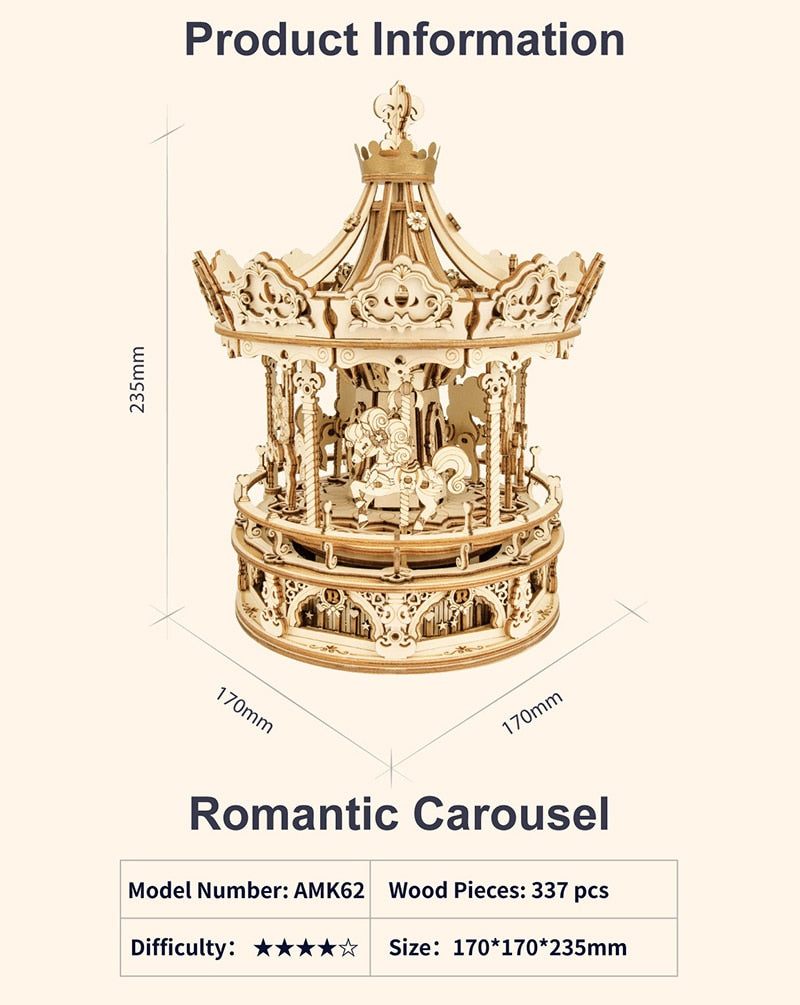 Perfect gift for children and adults. Assemble your own Rotatable romantic carousel music box . Instructions in English, however the simple step by step process allows easy construction in and language.