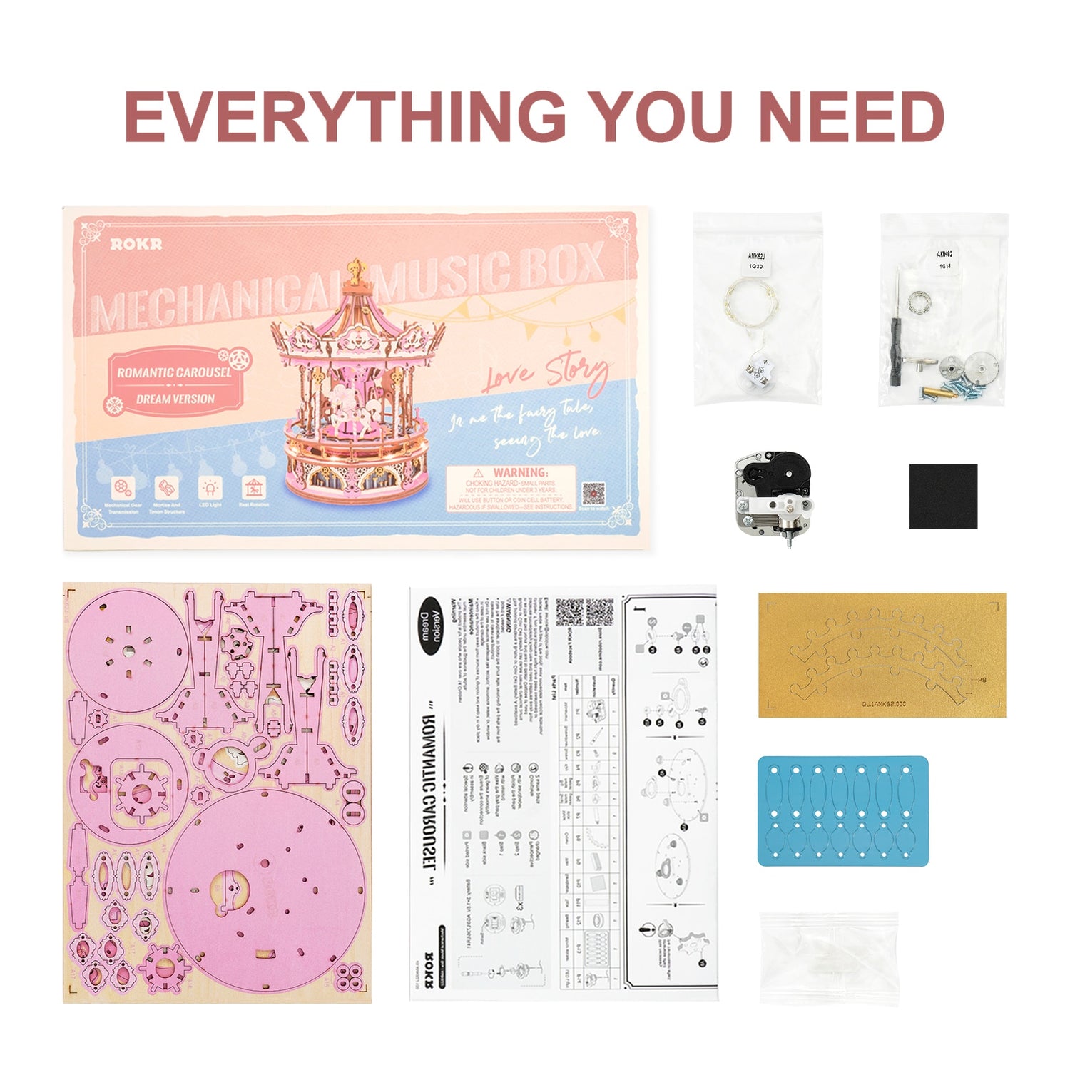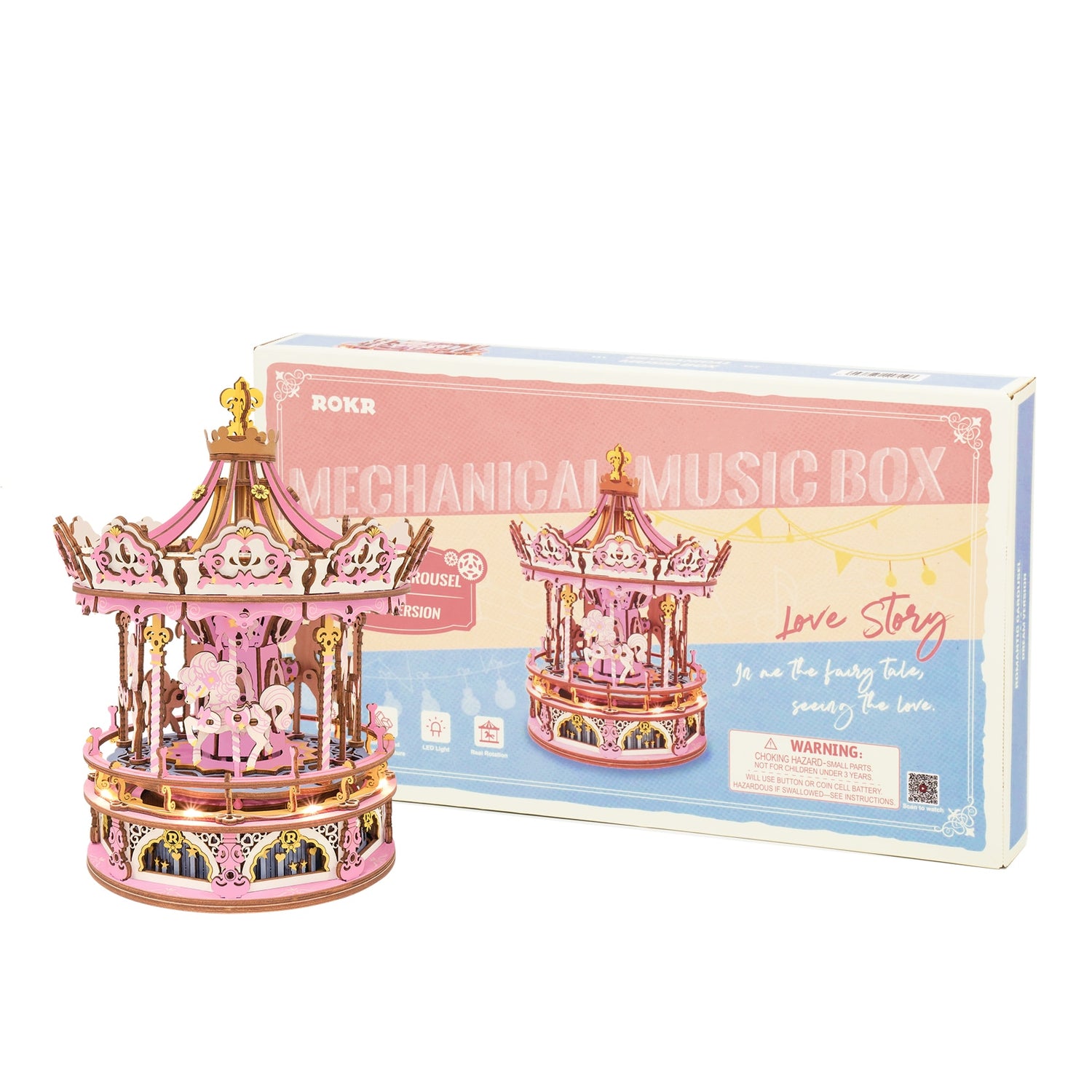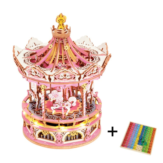 Robotime 336pcs DIY 3D Rotatable Romantic Carousel Music Box | Wooden Model Building Block Kits